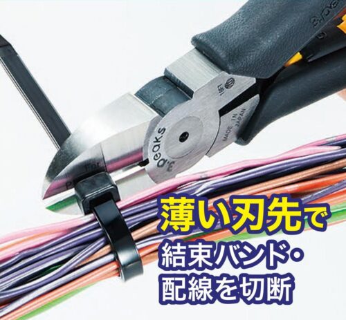 先端で結束バンドや配線、奥部で鉄線や太い線材を切断できます